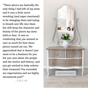 To redeem is to save, renew, preserve, and restore. As The Furniture Redeemer, I work with you to unlock the hidden potential in your furniture and family heirlooms with customization and refinishing that will help your pieces keep on telling their stories. My hope is that you will see the beauty lying in that old family heirloom or find a piece that you fall in love with!